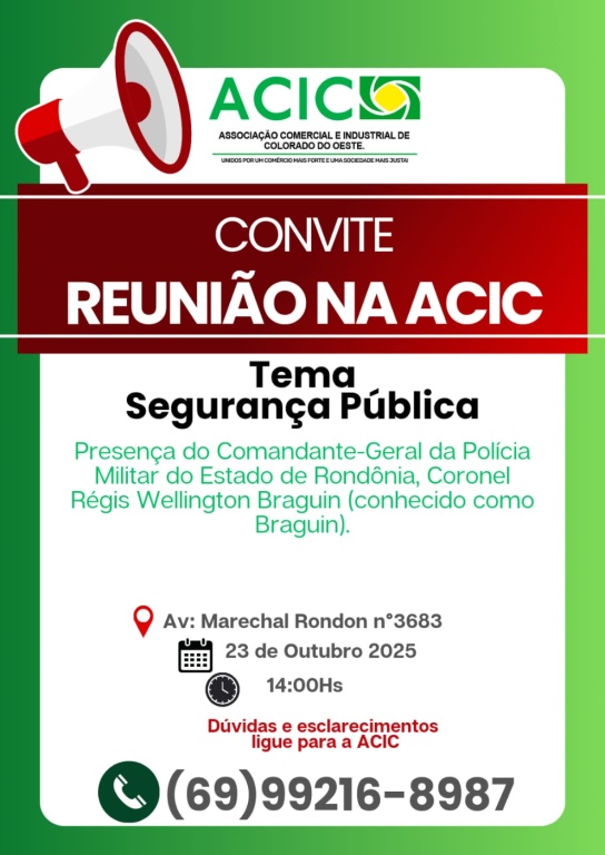 A Associação Comercial e Industrial de Colorado do Oeste (ACIC) convida todos os comerciantes e empreendedores do município para uma importante reunião na quinta-feira, dia 23 de outubro, às 14h, com a presença do Comandante-Geral da Polícia Militar do Estado de Rondônia, Coronel Régis Wellington Braguin (conhecido como Braguin).